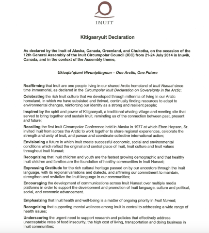 As declared by the Inuit of Alaska, Canada, Greenland, and Chukotka, on the occasion of the 12th General Assembly of the Inuit Circumpolar Council (ICC) from 21-24 July 2014 in lnuvik, Canada, and in the context of the Assembly theme,  Ukiuqta'qtumi Hivuniptingnun - One Arctic, One Future